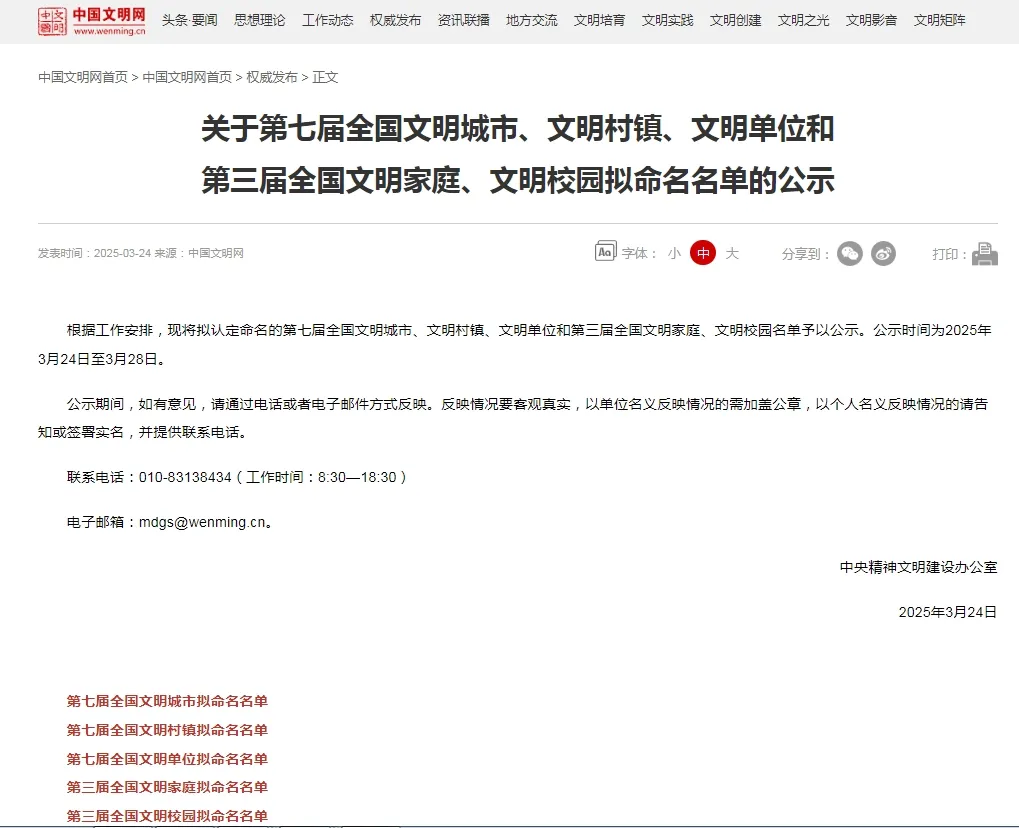 3月24日,中央文明办发布《关于第七届全国文明城市、文明村镇、文明单位和第三届全国文明家庭、文明校园拟命名名单的公示》。其中,齐齐哈尔医学院附属第一医院拟命名为全国文明单位。