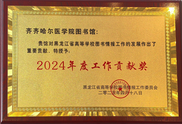 会议总结了2024年度黑龙江省高校图工委各项工作并对2025年度工作要点进行部署。会议还对2024年度作出贡献的单位做出了表彰。过去的一年,我院图书馆在黑龙江省高校图工委的指导下,出色完成各项工作任务,并对黑龙江省高等学校图书情报工作的发展作出了重要贡献,被黑龙江省高等学校图书情报工作委员会授予“2024年度工作贡献奖”。