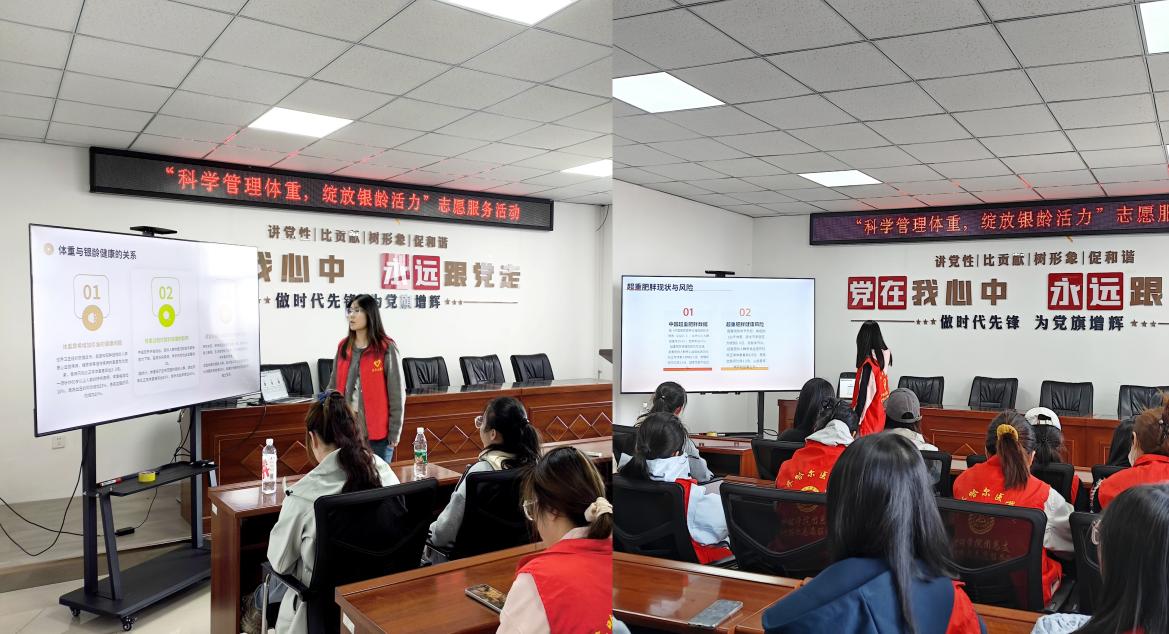 活动现场,杨舒馨同学以PPT形式,系统讲解了体重超标与高血压、糖尿病等慢性病的关联性,强调合理饮食与规律运动的重要性。蒙银银同学以“PPT+视频”相结合的方式,播放老年人安全运动的指导视频,并现场示范适合老年人的居家锻炼动作,帮助老年人更直观地掌握健康管理技巧。