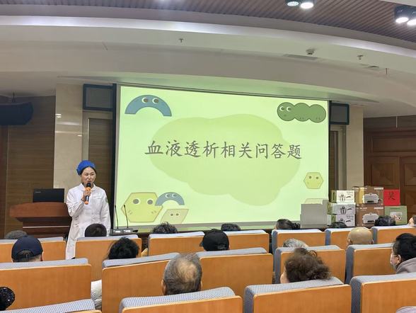 为搭建医患沟通的桥梁,传递健康、凝聚力量,4月17日下午,我院血液透析室在住院综合楼三楼会议室开展“关爱肾脏健康,共享美好生活”主题肾友会活动。众多肾病患者及家属们参加活动,我院肾内科负责人施莹、血液透析室护士长刘阳及血液透析室医护人员为大家进行科普讲座。血液透析室护士王欣、秦瑶主持活动。