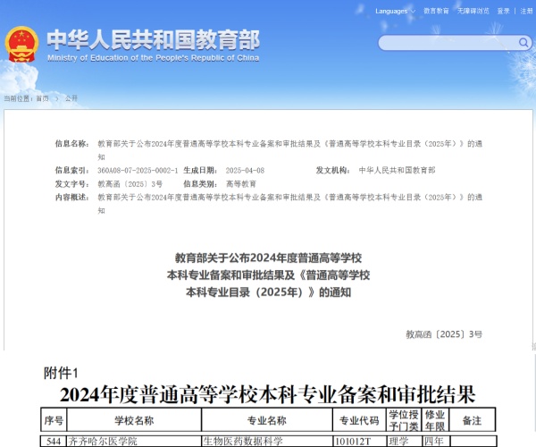 近日,从《教育部关于公布2024年度普通高等学校本科专业备案和审批结果的通知》获悉,学院申报的生物医药数据科学 本科专业成功通过教育部备案。目前,学院本科专业数量达到25个。