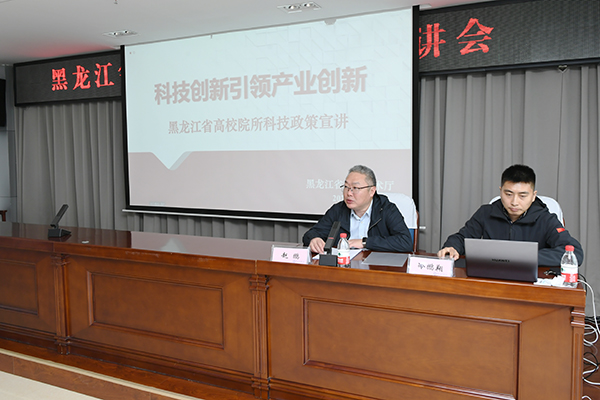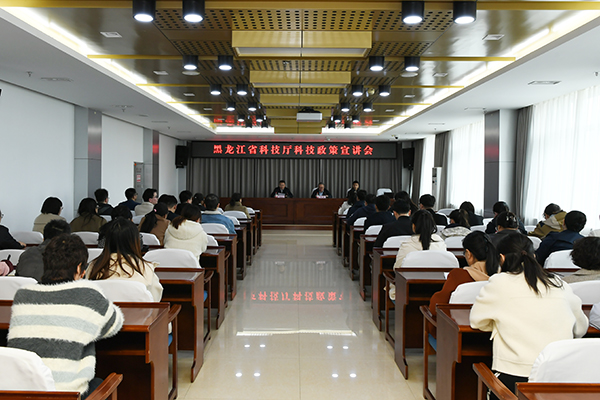 4月25日,黑龙江省科技厅创新体系与政策法规处处长赵鹏一行莅临学院开展科技政策宣讲。宣讲会在图书行政楼1801会议室举行,学院副院长于海涛主持会议。科研处全体工作人员、各二级学院分管科研副院长、科研管理人员及科研骨干教师100余人参会。