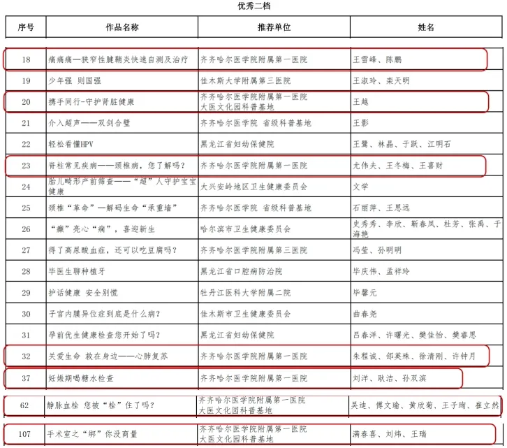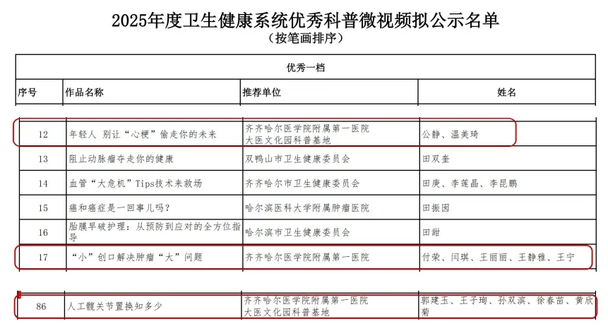 《年轻人 别让“心梗”偷走你的未来》《“小”创口解决肿瘤“大”问题》《人工髋关节置换知多少》斩获2025年度卫生健康系统优秀科普微视频优秀一档殊荣,《痛痛痛—狭窄性腱鞘炎快速自测及治疗》《携手同行-守护肾脏健康》《脊柱常见疾病——颈椎病,您了解吗?》《关爱生命 救在身边——心肺复苏》《妊娠期喝糖水检查》《静脉血栓 您被“栓”住了吗?》《手术室之“绑”你没商量》斩获2025年度卫生健康系统优秀科普微视频优秀二档殊荣。