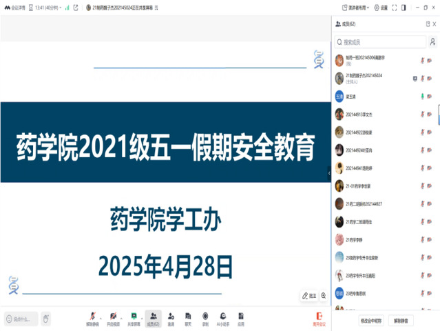 2025年4月27日至29日,药学院以年级为单位通过线上线下相结合的方式组织开展了“五一”假期学生安全教育大会,为同学们度过平安、愉快的假期筑牢安全防线。