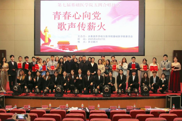 为传承五四精神,激发齐医学子爱国热情与青春活力,4月27日,基础医学院举办“青春心向党,歌声传薪火”主题第七届五四合唱大赛。学院党委书记潘洪明、党委副书记兼团委书记吕钢、全体辅导员及24级学生共同观看了比赛。
