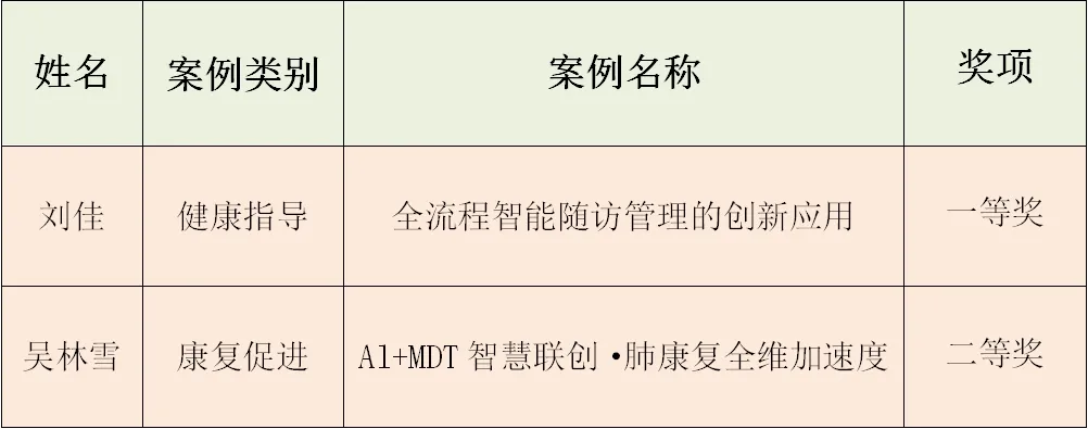 此次参赛的案例内容涵盖优质护理服务涉及的各个方面,包括医学照顾、病情观察、健康指导、专科护理、慢病管理、康复促进、心理护理、人文关怀、延伸护理等。经过前期筹备、初赛后,共有16名来自八家附属医院的参赛选手最终进入决赛,我院选手刘佳以《全流程智能随访管理的创新应用》为主题的健康指导类案例获一等奖;吴林雪以《Al+MDT智慧联创·肺康复全维加速度》为主题的康复促进类案例获得二等奖。