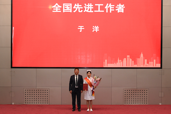 党委副书记张可勇为全国先进工作者于洋颁发证书、绶带