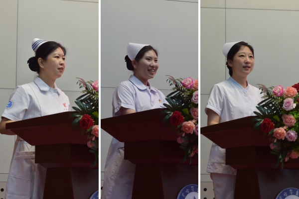 会上,全国人大代表、全国先进工作者、“中国好护士”2024月度人物,附属第一医院护理部副主任兼神经内科四病区护士长于洋;学院第六届模范护理工作者代表、附属第二医院的倪宏;以及学院第二届优秀护理服务案例获奖代表、附属第三医院的张悦,先后上台发言,分享了他们的工作心得和荣誉背后的故事。于洋在发言中深情回顾了自己的职业生涯,以及作为人大代表的履职经历,并紧密结合自身实际,深刻阐述了护理工作的深远价值与非凡意义。倪宏在发言中表示,护理工作不仅是技术的考验,更是生命的托付,对生命的敬畏,带给她职业的自豪感,也更能体验到护理的价值。张悦分享了自己的职业历程,从人文关怀的角度诠释护理工作的意义,护理工作不仅仅是完成任务,更是传递爱与温暖的过程。三位代表的发言,充分展现了护理人员的专业素养和无私奉献精神,也激励着在场的每一位护理工作者继续前行,为患者提供更优质的护理服务。