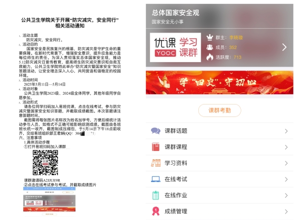 为深入贯彻落实总体国家安全观,提升学生防灾减灾意识,公共卫生学院于2025年5月11日至14日组织开展了“防灾减灾暨国家安全”知识答题活动,覆盖2023级、2024级全体学生,其他年级学生踊跃参与。
