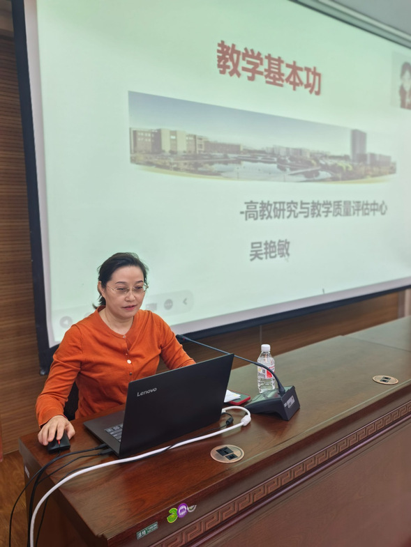 培训首讲由吴艳敏教授带来“教学基本功”专题。吴艳敏老师围绕备课、授课、课件三大板块展开深入讲解,从教学大纲与教材解读,到学生学情分析、教学目标设定;从教学方法、手段的运用,到教案书写规范,再到思政元素的巧妙融入、板书设计等细节,层层剖析,为教师们夯实教学基础提供了清晰指引。针对教案书写,吴艳敏老师特别指出评估中高频出现的共性问题,如思政元素融入的生硬化、板书设计的碎片化等,通过对比规范案例,系统演示如何将“课程思政”核心元素自然嵌入教学流程,为教师构建符合评估要求的标准化教学框架。