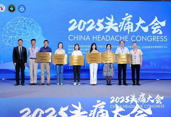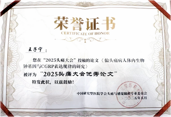 5月16日-18日,由中国研究型医院学会头痛与感觉障碍专业委员会、北京健康促进会、江苏省医学会神经病学分会联合主办的“2025中国头痛大会”在南京隆重召开,齐医附属二院神经内科五病区刘洋主任及其2023级研究生王子宁受邀参会,刘洋主任代表医院上台接受大会授予国家重点研发计划“常见多发疾病防治研究”专项偏头痛专病队列及临床研究平台应用示范单位牌匾。王子宁同学在“头痛青年医师分会场”作题为《偏头痛病人体内生物钟基因与CGRP表达规律的研究》的大会发言,该论文荣获“2025头痛大会优秀论文”奖项。