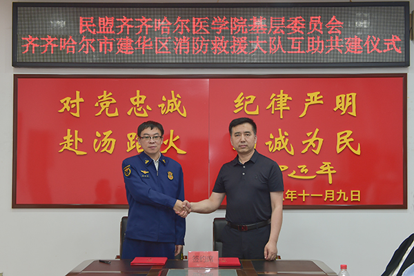 5月27日下午,民盟齐齐哈尔医学院基层委员会与齐齐哈尔消防救援支队建华区消防大队在建华区消防大队举行互助共建签约仪式,标志着双方在急救培训、消防安全宣传、科研与教学等领域的合作正式拉开帷幕。齐齐哈尔医学院党委副书记迟沫涵,党委常委、宣传统战部部长张宝林,建华区消防大队教导员高千宇,民盟市委副主委孙炜宇,民盟齐医基层委员会主委张春庆等出席签约仪式。