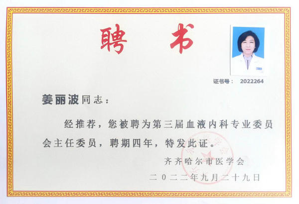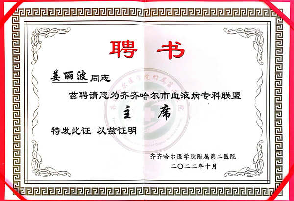 2022年,姜丽波教授成功当选年齐齐哈尔市医学会血液病分会主任委员、市血液病质控委员会主任,牵头成立了市血液病联盟,当选了联盟主席,极大推动了血液病基础疾病的基层普及。