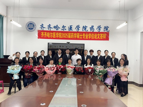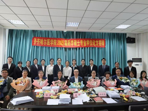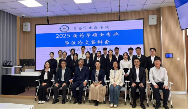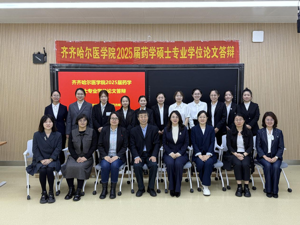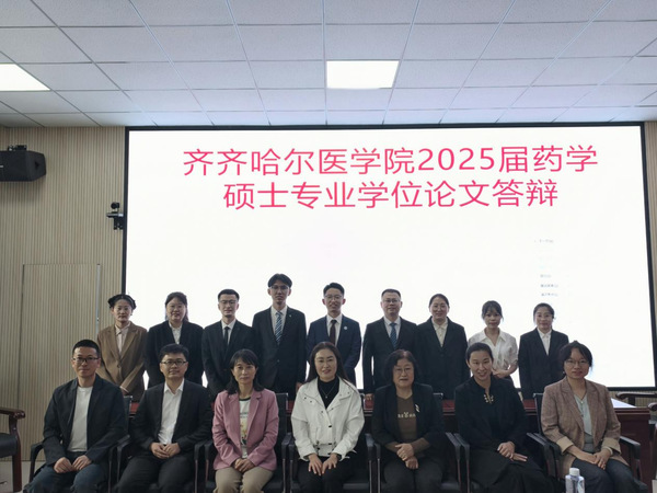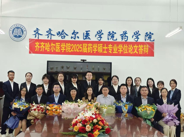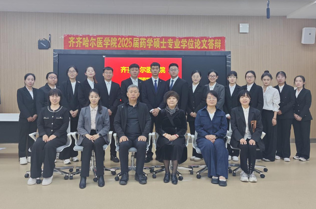 5月24日、5月25日药学院举办2025届药学硕士专业学位论文答辩会。中国医科大学魏敏杰教授,哈尔滨医科大学吕延杰教授,黑龙江中医药大学阎雪莹教授,陆军军医大学第二附属医院黄景彬副主任药师,齐齐哈尔大学赵冰教授、唐万侠教授,齐齐哈尔市药品检验中心刘春峰主任药师等应邀担任药学专硕各研究方向答辩委员主席及委员。学院党委书记、院长赵光,学院副院长于海涛出席会议并指导答辩工作。学院药学学科带头人刘吉成教授、研究生院副院长卢长方、科研处副处长岳丽玲、药学院领导班子成员、各方向答辩委员会成员,毕业生及毕业生导师、在读研究生等参加答辩会。