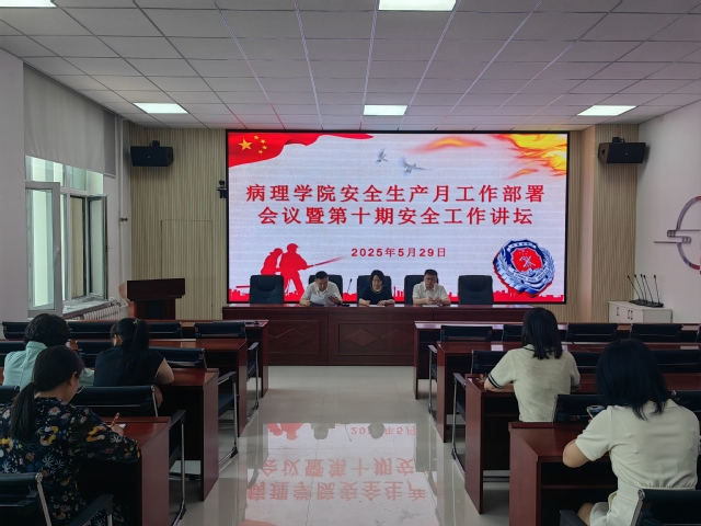 为贯彻落实学校 “安全生产月” 活动通知要求,全面部署安全生产月重点工作,病理学院于 5 月 29 日召开了安全生产月工作部署会议暨第十期安全工作讲坛。会议由李兴江院长主持,党总支书记李迎新、党总支副书记沈焕泉及全体教职工参加了此次会议。