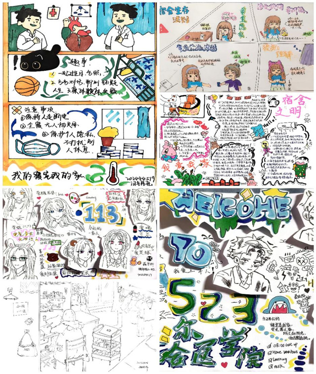 在“‘医’彩寝室”绘画创作赛中,同学们围绕“我的寝室我的家”“寝室生活小趣事”等主题进行创作。通过艺术笔触勾勒寝室生活趣事,增进室友情谊、丰富课余生活,描摹临床情境,探讨职业素养,沉淀职业道德,通过文化创意增进情谊,促进职业道德建设,表达医者情怀。
