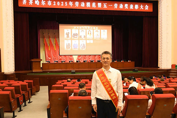 6月6日上午9时,齐齐哈尔市2025年劳动模范暨五一劳动奖表彰大会在市工人文化宫大剧场举行。学校精神卫生学院院长李平教授荣获2025年“齐齐哈尔市五一劳动奖章”荣誉称号并作为代表上台接受表彰,附属第二医院血液内科二病区主任姜丽波、附属第一医院副院长刘增良荣获2025年“齐齐哈尔市劳动模范”荣誉称号。