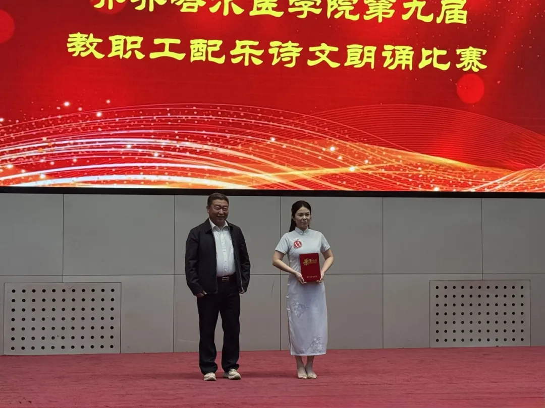 为纪念中华全国总工会成立100周年,长征胜利90周年和中国人民抗日战争战争胜利80周年,丰富和发展大医文化内涵,深入推进“书香医园”建设,营造浓郁的校园文化氛围,弘扬优秀传统文化,充分展示教职工的风采。6月6日下午,齐齐哈尔医学院举办第九届“诵读经典 品味书香”朗诵比赛。我院选手公静经过选拔推荐,代表医院参赛,她以精湛的朗诵技艺、真挚的情感表达和独特的舞台感染力,获得第一名的好成绩!