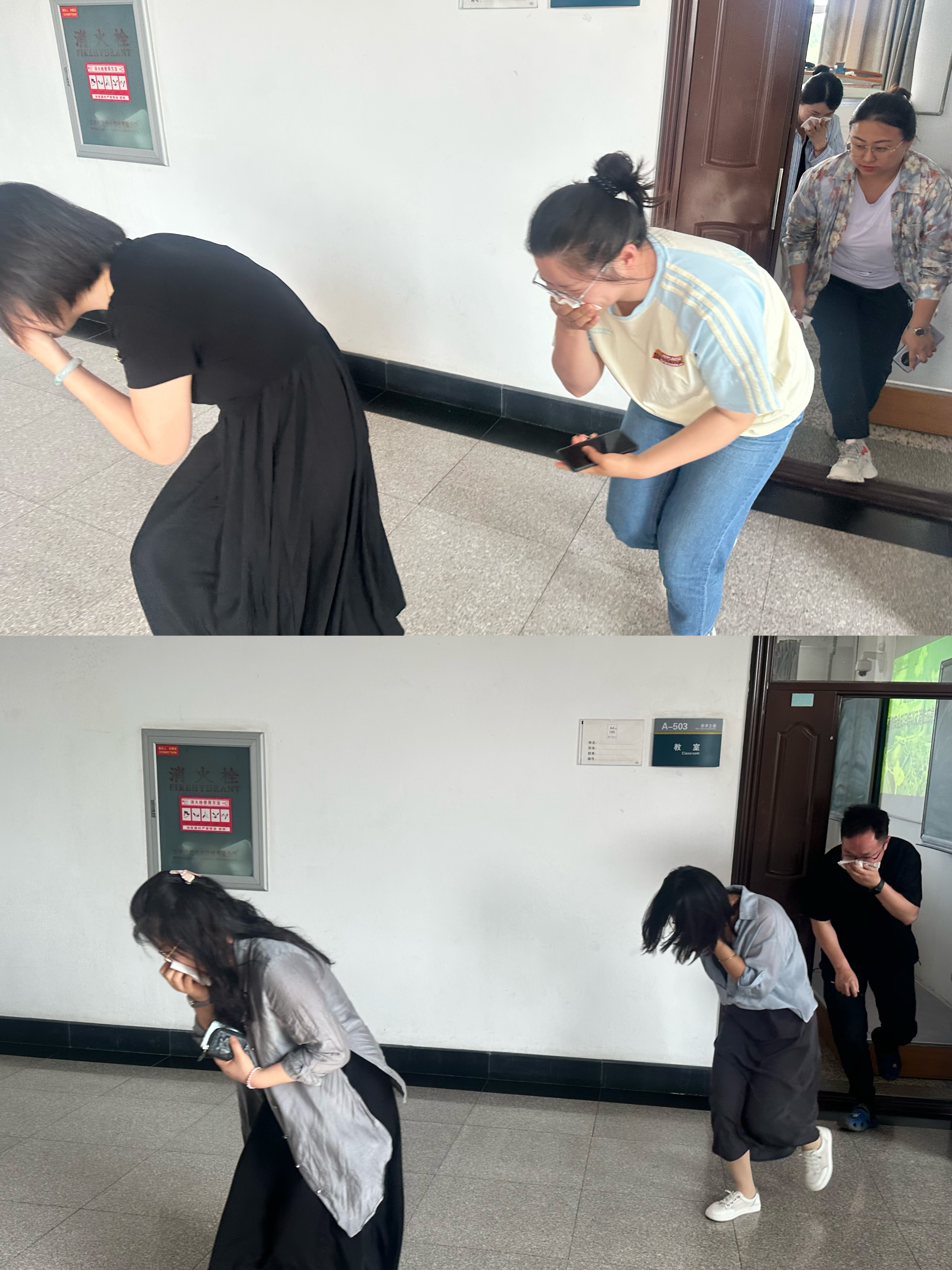 讲座结束后,随着警报声响起,与会教师模拟火灾现场开展应急逃生演练,大家在王维君教官的指挥下用湿毛巾捂住口鼻,压低身体,弯腰小步快走,有序地从消防通道撤离。