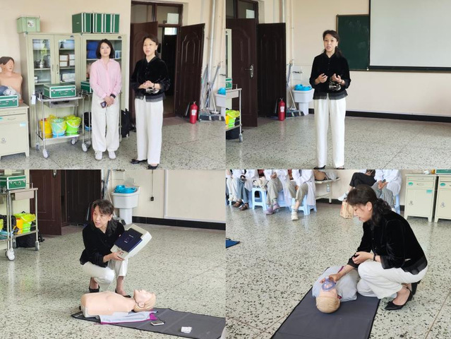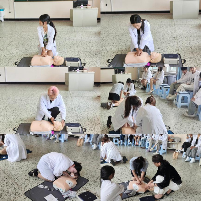 王秀清老师结合丰富实践经验与专业知识,先带领同学们系统复习了心肺复苏(CPR)操作流程——从判断患者意识、呼吸的关键要点,到胸外按压、开放气道、人工呼吸的流程,每一步都细致讲解并现场演示,确保大家“看得懂、学得会”。随后,针对自动体外除颤器(AED)的使用,王老师以“理论+实操”结合的方式,重点解析操作流程与注意事项,引导同学们亲手练习,在实践中掌握急救技能核心。