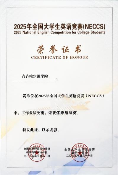 近日,2025年全国大学生英语竞赛决赛成绩揭晓,学院本科生、研究生荣获多个奖项。其中,2024级护理学专业陈元喆、医学影像学专业滕星月、预防医学专业胡洋铭、2023级临床医学专业许新琳荣获C类全国一等奖;2024级外科学专业研究生李旭东荣获研究生A类全国一等奖。同时,21名学生获C类全国二等奖,35名学生获C类全国三等奖;8名学生分别获得研究生A类全国二等奖、三等奖。学院荣获“全国优秀组织奖”,孟婷老师荣获“个人优秀组织奖”称号。
