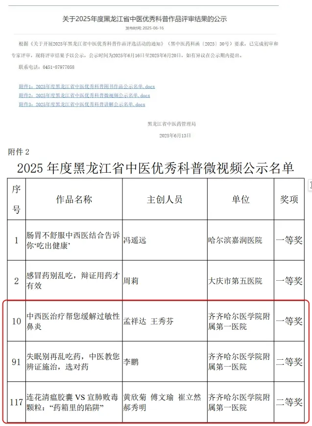 近日,黑龙江省中医优秀科普作品评选结果重磅揭晓,齐医附一院选送的3部科普微视频凭借扎实的专业内容、生动的表现形式脱颖而出,一举揽获一等奖1项、二等奖2项的优异成绩,这不仅是对医院科普工作的高度认可,更彰显了医院在中医药知识传播与健康科普领域的卓越实力。