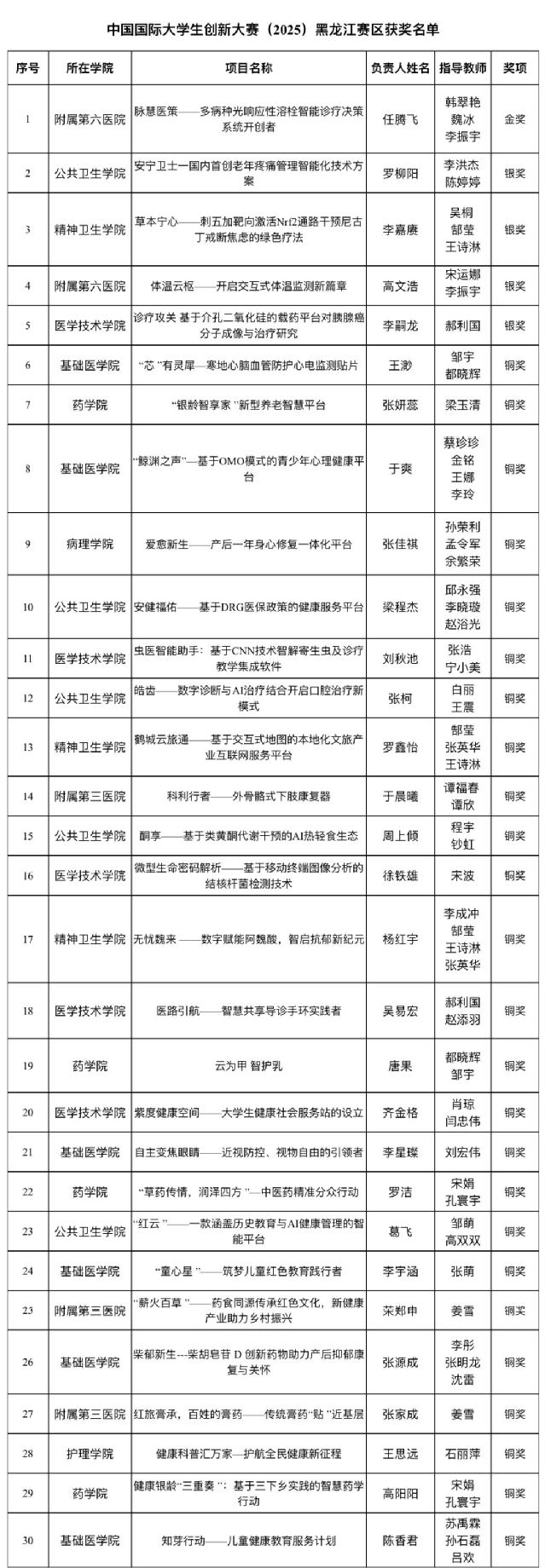 6月18—19日,由黑龙江省教育厅主办的“建行杯”中国国际大学生创新大赛黑龙江赛区决赛在哈尔滨工业大学圆满落幕。齐医学子以“1金4银25铜”的优异成绩刷新了学院在该项赛事的历史最好成绩。其中,学院附属第六医院任腾飞团队项目《脉慧医策——多病种光响应性溶栓智能诊疗决策系统开创者》(指导教师:韩翠艳、魏冰、李振宇)在544个决赛项目中脱颖而出,斩获高教主赛道金奖,实现学院近五年该赛事金奖“零的突破”。