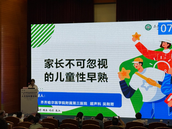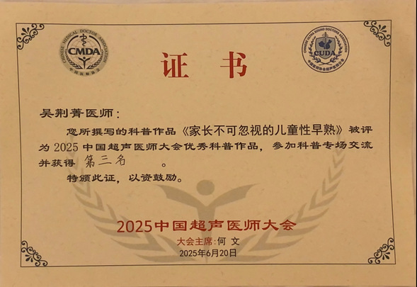 超声科吴荆菁医生的科普作品《家长不可忽视的儿童性早熟》荣获 “2025中国超声医师大会优秀科普作品” 称号,并凭借其深刻的选题洞察与通俗易懂的讲解,在激烈的竞争中斩获全国第三名的优异成绩。该作品是黑龙江省唯一入选中国医师协会超声医师分会科普专场展示的作品,作品聚焦家长普遍关心却易忽视的儿童性早熟问题,对提升公众认知、护航儿童健康成长具有重要指导意义。这一佳绩是对吴荆菁医生个人科普能力的高度认可。