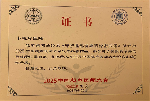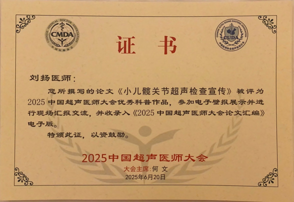 与此同时,我院超声科卜艳玲医生报送的《守护腿部健康的秘密》和刘扬医生报送的《小儿髋关节超声检查宣传》均成功入选中国医师协会超声医师分会电子壁报展示环节,并双双被评为“2025中国超声医师大会优秀科普作品”。两位医生在现场进行了汇报交流,作品被收录入《2025中国超声医师大会论文汇编》电子版。两部作品分别聚焦腿部血管健康维护和儿童髋关节发育筛查,内容专业、形式新颖、图文并茂,有效普及了超声检查在相关疾病早发现、早预防中的关键作用,赢得了评委和同行的一致好评。