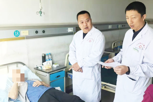 援讷党员、泌尿外科一病区副主任医师徐广驰(左一)在讷河市人民医院带领当地医生查房