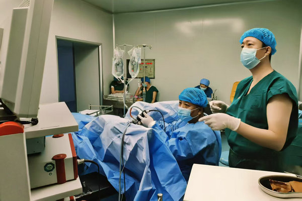 援讷党员、泌尿外科一病区副主任医师徐广驰(左一)支援讷河市人民医院开展手术