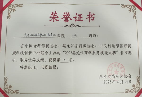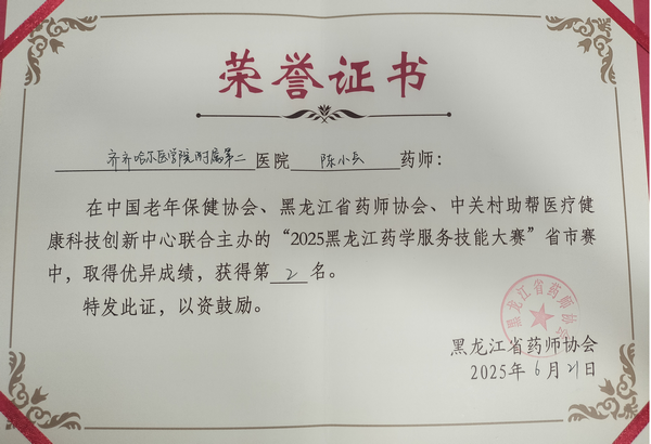 6月21日,由中国老年保健协会、黑龙江省药师协会、中关村助帮医疗健康科技创新中心联合主办的“2025黑龙江药学服务技能大赛”落下帷幕。齐医附属二院药学部王杰、陈小兵荣获大赛团队第二名。