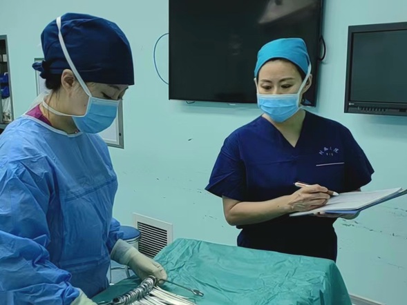 我院手术室护士长魏雪莲(右)指导护士清点器械