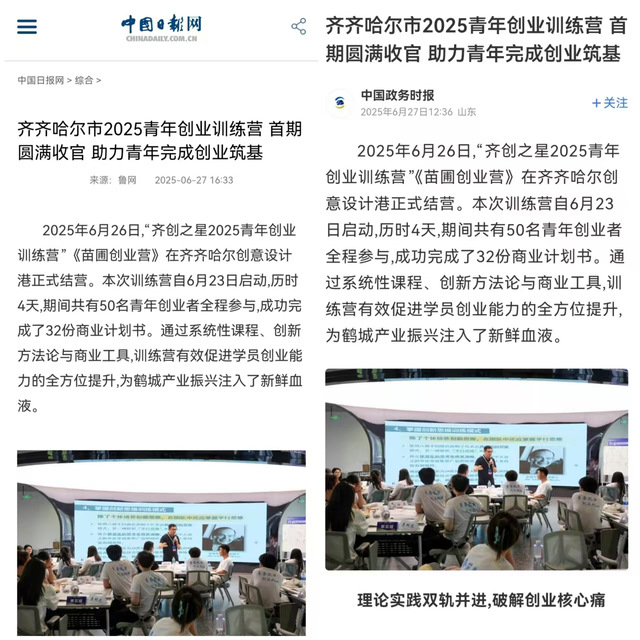 本次青年创业训练营汇聚了齐齐哈尔医学院、齐齐哈尔大学、齐齐哈尔工程学院三所高校及社会青年创业者共50人。在系统化的创业课程培训和创新方法论与商业工具应用训练过程中,参训学员共完成了32份商业计划书,在创业策划、市场分析及路演展示等方面获得显著提升。活动受到广泛关注并经多家媒体报道。