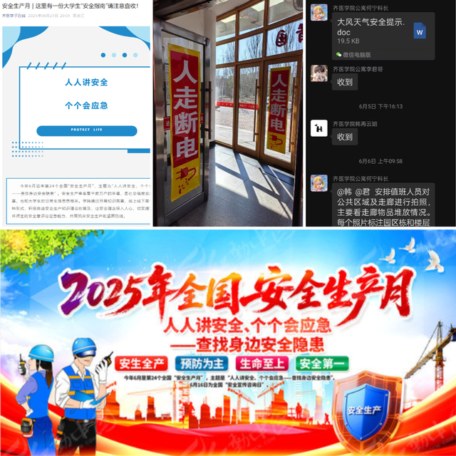 2025年6月是全国第24个“安全生产月”,学院按照省教育厅安全工作部署要求,紧密结合校园安全工作实际,制定并下发了《关于组织开展学院2025年“安全生产月”活动的通知》,紧扣“人人讲安全、个个会应急——查找身边安全隐患”主题,在全院范围内开展了形式多样的宣传教育活动,筑牢校园安全防线。