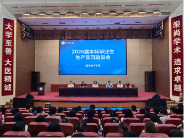 7月3日下午,医学技术学院在图书馆二楼多功能厅召开了2026届本科毕业生生产实习动员会。学院党委书记孙贺,副院长张浩,党委副书记佡思维及2026届医学检验技术、医学影像技术、康复治疗学及生物医学工程等本科专业的辅导员及实习学生参加了本次会议。会议由学院教务科科长吴丽娜主持。