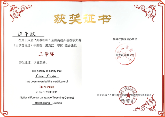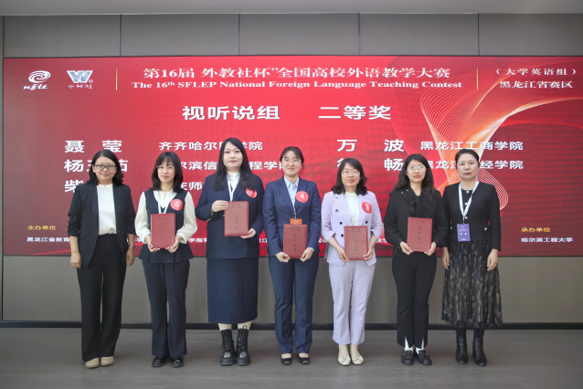 本次大赛由黑龙江省教育厅主办,黑龙江省高等学校大学外语教学指导委员会、黑龙江省高等学校外国语言文学类专业教学指导委员会、上海外语教育出版社协办,哈尔滨工程大学承办。经严格评审选拔,来自全省各高校的58名优秀教师成功晋级复赛阶段。其中,综合课组12名教师、视听说课组9名教师凭借出色的教学表现入围黑龙江赛区决赛。在学院领导和教务处的大力支持下,外语教研部教师凭借扎实的专业功底、严谨的教学设计和稳定的临场发挥,荣获二等奖、三等奖各一项。