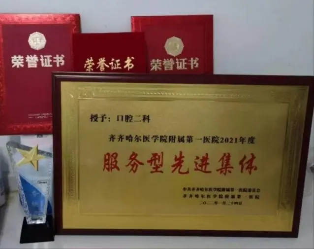 齐齐哈尔医学院附属第一医院口腔二科现有医生6人,党员4人。是一支有朝气、有责任心,致力于为人民服务的年轻队伍。科室内医生各有专长,在口内、口外、修复、正畸、种植等二级学科领域中全面发展。近几年来,口腔二科在薛徽博士的带领下,以严谨务实、一丝不苟的工作态度,坚持“以患者为中心”的理念,以提高患者满意度为目标,从提高队伍整体素质出发,把服务质量当作头等大事,不断优化服务流程,树立了科室的良好形象。在医院2021年度命名表彰大会上,曾荣获“第二季优质服务——服务型先进集体”等荣誉称号。