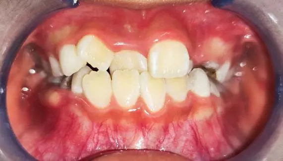 (从X光片及口内可见左上尖牙将异位萌出,阻碍侧切牙排齐,并且拥挤量过大无法完全靠扩弓解决,左上侧切牙的扭转及全口牙列拥挤待替牙完成后进行二期固定矫治排齐)