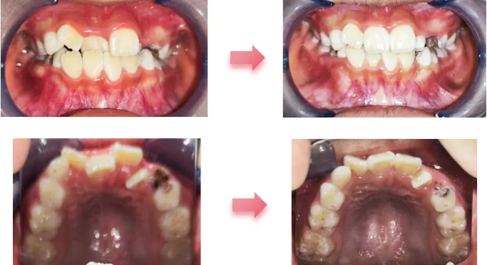 经过两个月的扩弓,杨妈妈带孩子复诊时惊喜地说,原本藏在里面的上门牙竟然自己来到了前面。医生向她解释,这是因为扩弓使原本被挤在后面的牙齿得以舒展归位了。扩弓到位后,又经过几个月的推上前牙唇向移动,上下前牙解除了颌干扰,排列也更加整齐美观了。经过医生的考量和杨妈妈、杨小酒的一致同意,结束了为期半年的替牙列期早矫,医生为小酒重新留存了一组颌面照,这一次,小酒恢复了往日灿烂的笑容。
