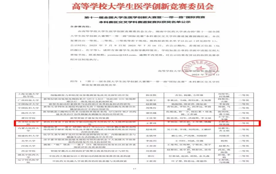 7月5-7日,高等学校大学生医学创新竞赛委员会主办,湖南中医药大学承办的第十一届全国大学生医学创新大赛暨“一带一路”国际竞赛药学中医药、交叉学科赛道和国际竞赛复赛圆满落幕。齐齐哈尔医学院附属第一医院王梦琦团队凭借项目《新医科背景下叙事医学驱动的临终关怀医学人文精神创新研究》斩获二等奖,不仅展现了团队的科研实力与创新精神,更实现了医院在这一基础医学类顶级赛事上“零的突破”。