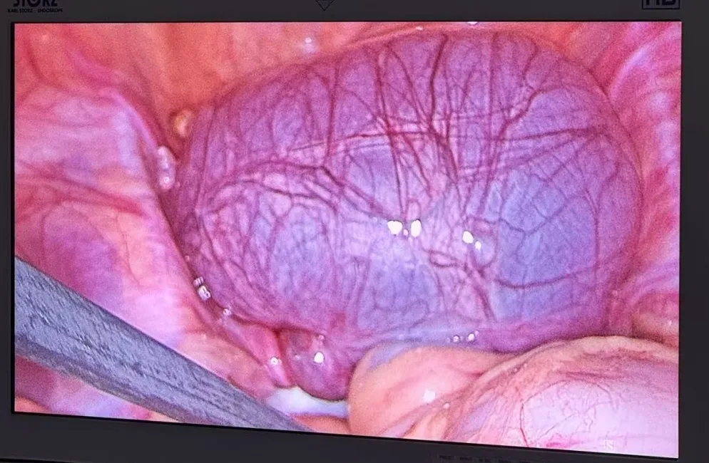 危急时刻,妇产科副主任王丹凭借丰富的临床经验与精准判断,在充分告知家属病情风险后,与手术室沟通,开启绿色通道。无影灯下,腹腔镜微创技术展现了它的精妙——仅通过几个小小的操作孔,王丹副主任娴熟地操控着器械。当镜头探入腹腔,病因一目了然:左侧输卵管系膜囊肿发生严重蒂扭转!
