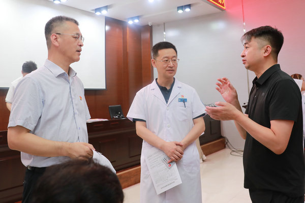 市中心血站献血服务科副科长张旭与医院领导亲切交流