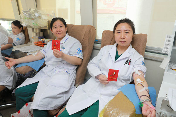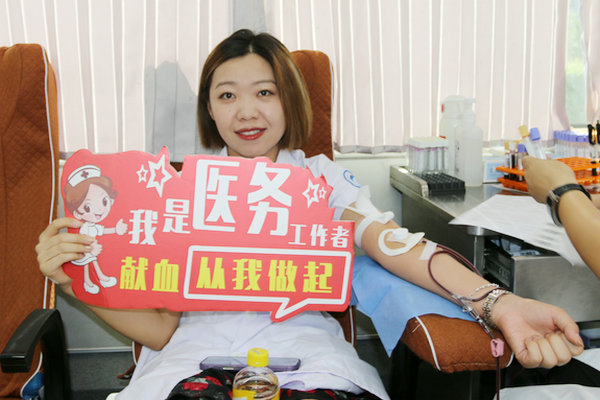 血液内科一病区、风湿免疫科护士长曾庆兰、风湿免疫科主诊医师组组长宋健带领科室医护人员挽袖献血