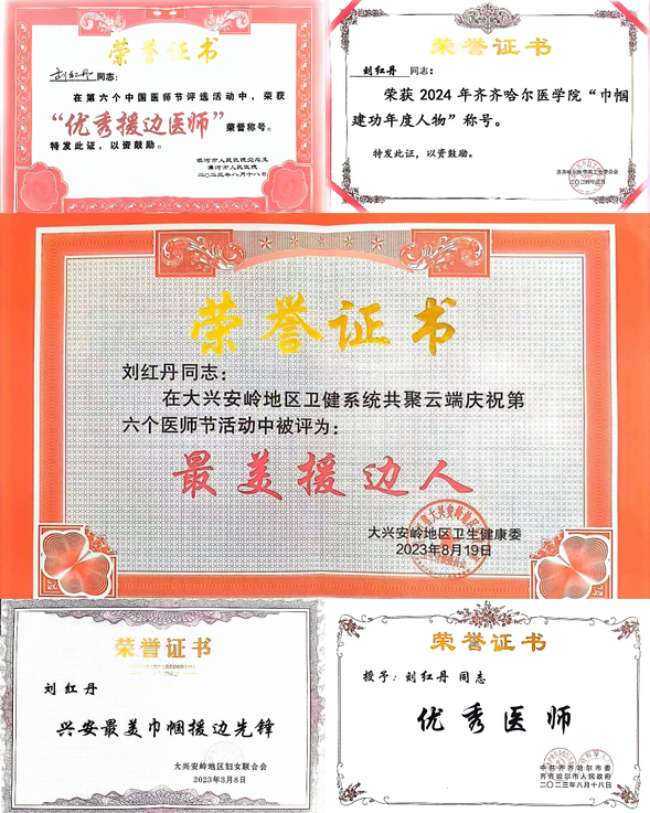 刘红丹援边工作成效卓著,获得了大兴安岭地委、漠河市委领导的高度评价和多次嘉奖。她个人也因贡献突出,相继荣获2022-2023年度附属三院“先进个人”、2023年度大兴安岭地区“兴安最美巾帼援边先锋”(地区妇联授予)、漠河市人民医院“优秀援边医师”、大兴安岭地区卫健委“最美援边人”、中共齐齐哈尔市委市政府“优秀医师”以及2024年齐齐哈尔医学院“巾帼建功年度人物”等多项荣誉称号,谱写了医者大爱跨越山海的动人篇章。