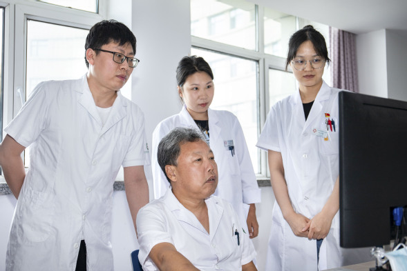 乳腺外科主任李祖彬(中)带领科室医生查看电子胶片
