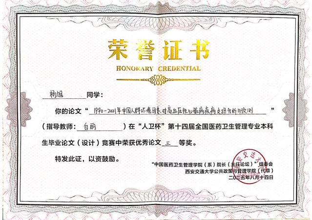 8月14日,第二十一届“中国医药卫生管理学院(系)院长(主任)论坛”在西安交通大学举行。会上公布了第十四届“人卫杯”全国医药卫生管理专业本科毕业论文(设计)竞赛结果,公共卫生学院2025届本科毕业生杨旭撰写的毕业论文《1990—2021年中国人群环境因素对高血压性心脏病疾病负担分析与预测》(指导教师:白丽)荣获优秀论文三等奖。