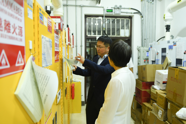 裴俊瑞一行先后深入科技楼、实验动物楼、形态楼等实验场所,重点查看了实验室开学准备工作情况、实验室安全责任制落实、危险化学品管理、特种设备运行安全、气体钢瓶与危险废弃物存放、实验室环境卫生、消防安全及用电安全等关键环节。在检查过程中,裴俊瑞与研究生亲切交流,详细了解了他们的学习进度和科研实验进展,并就实验环境改善与条件优化等问题征询了意见。同时,现场协调解决了部分科研人员在工作中遇到的实际困难。