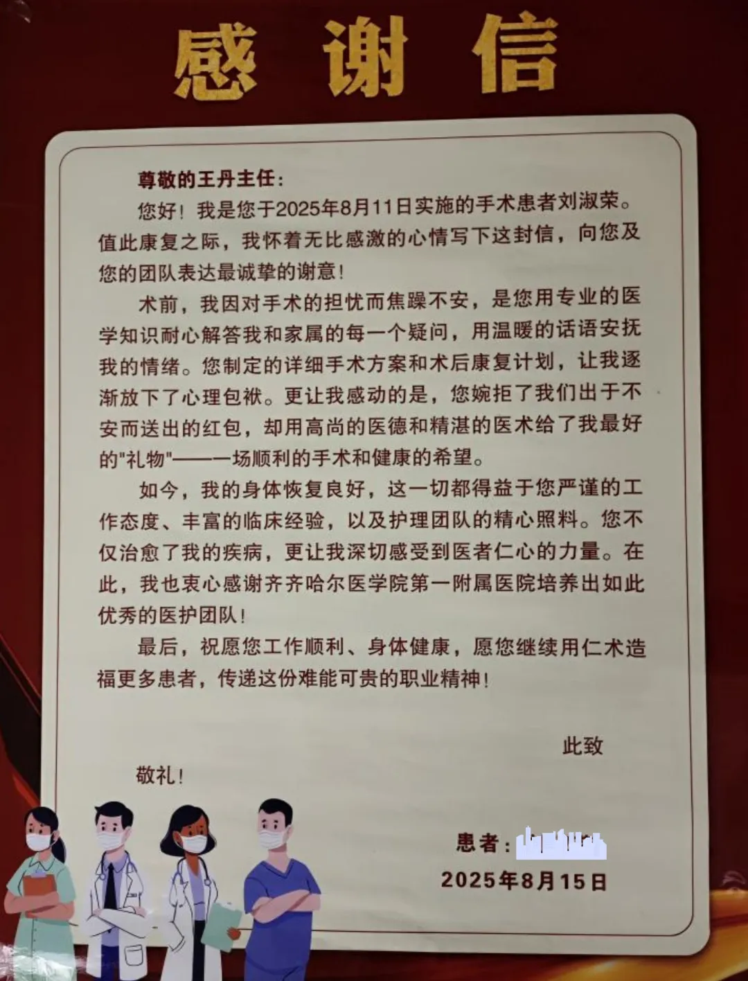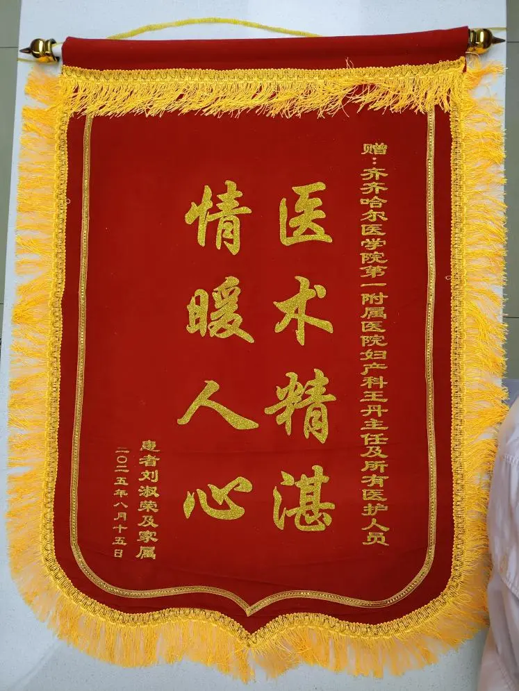 近日,一位出院患者将一面写有“医术精湛、情暖人心”的锦旗和一封情真意切的感谢信,专程送到齐齐哈尔医学院附属第一医院妇产科副主任王丹手中,再三感谢她在住院期间所提供的精湛治疗与温暖入微的健康指导,表达了对王丹主任及科室全体医护人员浓浓的感激之情。