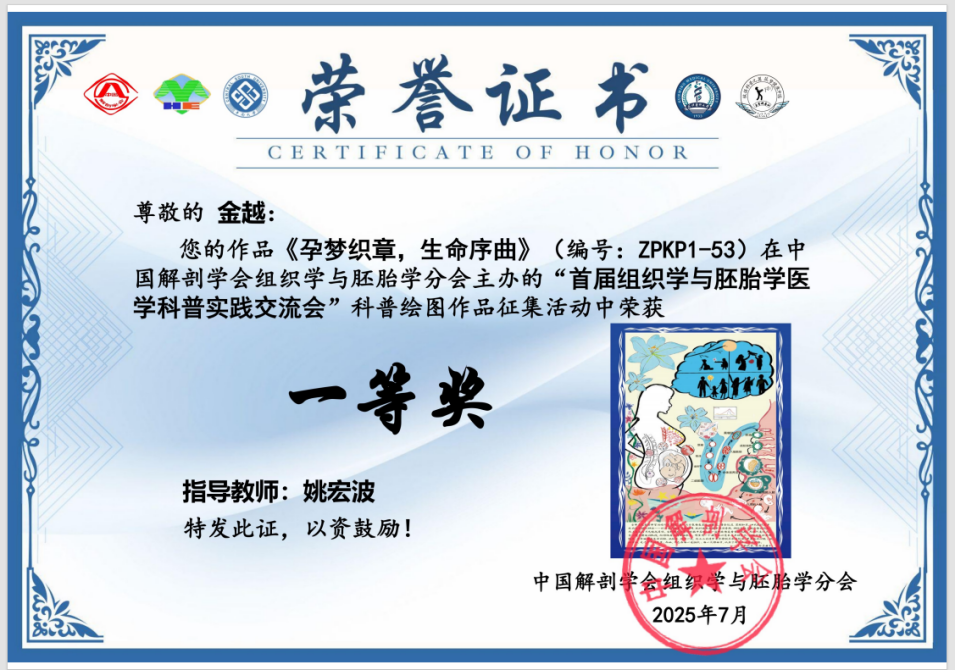 2024级基础医学硕士研究生金越同学在其导师姚宏波副教授的指导下,其作品《孕梦织章,生命序曲》斩获一等奖,并在大会作创意汇报。作品以顺时针螺旋时间轴呈现从受精到 8 周龄人胚的发育过程,融合母体组织的解剖透视,并以六朵百合象征 “新生、纯洁与希望”,通过花瓣线条延伸与云朵意象,传递对胎儿未来的美好期许,展现了医学与人文艺术的深度融合。